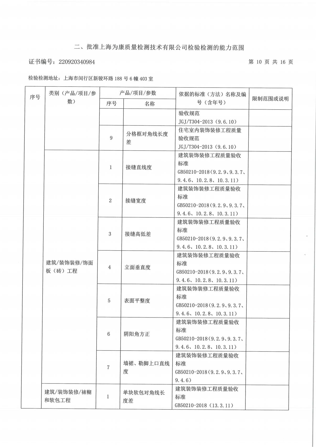 隨著經濟技術的發展,人們生活水平的提高,人們逐漸要提高和改善自己的居住和工作環境,在對居 住環境、辦公樓進行裝飾裝修時必然要采用大量的建筑和裝修材料,在美化室內環境的同時也帶來了 大量的污染物,這些室內環境中存在的污染物具有成分復雜、低濃度、接觸時間長、影響人群眾多和 產生健康影響的效應潛伏期長等特點。 為了保護室內人群的身心健康和促進員工的工作效率,國內外各單位和機構投入大量精力和財力進行 研究和實施達到室內人群可接受的室內污染物水平的措施和管理程序,為創造良好的樓宇室內環境質 量,針對室內污染的控制要素主要有:物理性指標、化學性指標、生物性指標和放射性指標四大類, 各主要要素的控制限值詳見下表(摘自《室內空氣質量標準》): 服務范圍: 1、個人家庭新房裝修污染空氣檢測。 2、學校、幼兒園等公共場所空氣檢測。 3、辦公室室內空氣污染檢測、甲醛檢測。 檢測依據及相關規定: 檢測依據:GB/T18883-2002《室內空氣質量標準》 檢測內容及限量標準: 室內環境質量評價標準 污 染 物 級 別 類 別 項 目 單 位 一 級 二 級 三 級 物理性指標 可吸入顆粒物 μg/m3 50 150 250 溫度 ℃ 23-26 23-26   21-23 21-23   濕度 % 50-60 55-65   40-50 >≤40   空氣流速 m/s <0.2 <0.25 <0.3 <0.15 <0.2 <0.2 噪聲 dB ≤45 ≤55 ≤65 ≤30 ≤45 ≤60 新風量 m3/h.人 60 30 15 化學性指標 甲醛 mg/m3 0.04 0.08 0.12 苯 μg /m3 10 20 30 二甲苯 mg/m3 0.03 0.60 0.90 TVOC μg /m3 200 300 600 苯并(α)芘 ng/m3 不得檢出 1 2 氨 mg/m3 0.1 0.2 0.5 CO2 ppm 600 1000 1500 CO mg/m3 3 5 10 O3 mg/m3 0.10 0.12 0.16 SO2 mg/m3 0.15 0.15 0.25 NO2 mg/m3 0.10 0.10 0.15 生物學指標 細菌總數 cfu/m3 1000 2000 4000 放射性指標 氡及其子體 Bq/m3 100 100 200 檢測周期: 自進場采樣后4-6工作日出具加蓋CMA(檢驗檢測授權專用章)檢測報告,具體報告周期視檢測量 及客戶實際要求為準。 檢測報告內容: 最終檢測報告包括以下內容: 1、工程概況; 2、檢測方法采用標準; 3、檢測使用設備; 4、檢測結果數據; 5、檢測報告編制、審核、批準人員信息; 6、檢測專用章及國家檢驗檢測機構授權專用章。 三、套內質量檢測(一房一驗) 分戶驗收要求 分戶驗收:即交房前依照相關標準對區域內住宅逐套進行驗收。自2009年10月1日起所有上海市 住宅工程強制實施分戶驗收。《上海市工程質量分戶驗收管理規定》住宅工程竣工驗收前必須依照《住 宅工程套內質量驗收規范》DG/TJ08-2062-2009和現行工程質量標準、規范,對每戶套內的觀感質 量、使用功能及使用安全進行驗收。凡未實施分戶驗收的,該工程項目將不得交付使用; 服務范圍 一、裝修房全過程跟蹤檢查:從毛坯到裝修結束全過程跟蹤檢驗;對隱蔽工程施工進行檢測;對裝飾 材料進行控制;每個施工節點作好原始記錄并提出整改意見;待整改結束進行復查,直至符合 要求;最終每戶出具一份檢測報告。 二、裝修房竣工驗收:主要對安全、使用功能及表面觀感質量進行檢測;每個施工節點作好原始記錄并提出整改意見;待整改結束進行復查,直至符合要求;最終每戶出具一份檢測報告。 三、毛坯竣工驗收:主要對安全、使用功能及表面觀感質量進行檢測;每個施工節點作好原始記錄并提出整改意見;待整改結束進行復查,直至符合要求;最終每戶出具一份檢測報告。 四、個人交房驗房檢測。 建設工程分戶驗收檢測參考標準 DG/TJ08-2062-2017 《住宅工程套內質量驗收規范 》 DB/T 31/30-2003《住宅裝飾裝修驗收標準》 GB50209-2002《建筑地面工程施工質量驗收規范》 GB50210-2001《建筑裝飾裝修工程質量驗收規范》 GB20242-2002《建筑給排水及采暖工程施工質量驗收規范》 GB50300-2001《建筑工程施工質量驗收統一標準》 GB50303-2002《建筑電氣工程施工質量驗收規范》 套內質量檢測(一房一驗)內容 檢測內容 建筑尺寸 室內地面:水泥砂漿地面、木、竹地板,板塊地面 室內頂棚:頂棚抹灰、吊頂工程 室內墻面:墻面抹灰、飾面板(磚)墻面、涂飾工程、裱糊工程、軟包工程 建筑門窗 樓梯與護欄 細部工程:櫥、柜,窗簾盒、窗臺板、門窗套、可折裝式隔斷、淋浴房 給排水與燃氣:室內給水、室內排水、衛生器具、燃氣管道 通風與空調:送排風和防排煙、空調工程、 室內電氣:燈具安裝、開關、插座,分戶配電箱、室內配線、等電位聯結 弱電工程:有線電視安裝工程、電話、信息網絡安裝工程,訪客對講安裝工程、安防報警系統 太陽能熱水系統 室內環境評價 四、空調與通風系統檢測 1、服務范圍 通風與空調系統風系統、水系統檢測; 通風與空調機組各功能段性能檢測; 通風與空調管道性能檢測; 空調房間室內環境檢測; 通風與空調系統節能性評價,通風與空調系統報監檢測。 2、檢測依據 GB50411-2007 《建筑節能工程施工質量驗收規范》 GBT19232-2003 《風機盤管機組》 GBT14294-1993 《組合式空調機組》 DG/TJ08-802-2005《通風與空調系統性能檢測規程》 DG/TJ 08-802-2005《通風與空調系統性能檢測規程》 GB 50243-2002《通風與空調工程施工及驗收規范》 GB 50411-2007《建筑節能工程施工質量驗收規范》 3、通風與空調系統檢測注意事項 1、通風與空調系統檢測進場前須要提供設計說明圖紙、主要設備參數表、風管、風口、水管布置圖; 2、通風與空調系統檢測進場前,系統應運行穩定一段時間,標準時間8小時,適當可減少; 3、通風與空調系統檢測
